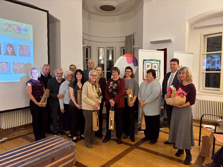 Am Freitag, 24. Oktober fand als Abschluss die Jubiläumsveranstaltung statt. Nach den Grußworten von Hausherr P. Gotthard Niedrist, Bürgermeister Nikon Baumgartner und dem Leiter der Bibliotheksfachstelle des Landes OÖ Mag. Christian Dandl, die alle die Wichtigkeit des Ehrenamtes hervorhoben, gab Büchereileiterin Irmgard Stieger einen Überblick über das Geschehen der vergangenen 25 Jahre. Bürgermeister Baumgartner bedankte sich beim Team für die zahlreich geleisteten ehrenamtlichen Stunden. Für reichlich Lacher sorgte anschließend Sabine Falk, alias Hanni Ahorn, mit ihrem Clowntheaterstück „Topf und Deckel“. Sie entführte das Publikum äußerst humorvoll und musikalisch in die 1950er bis 1980er Jahre.