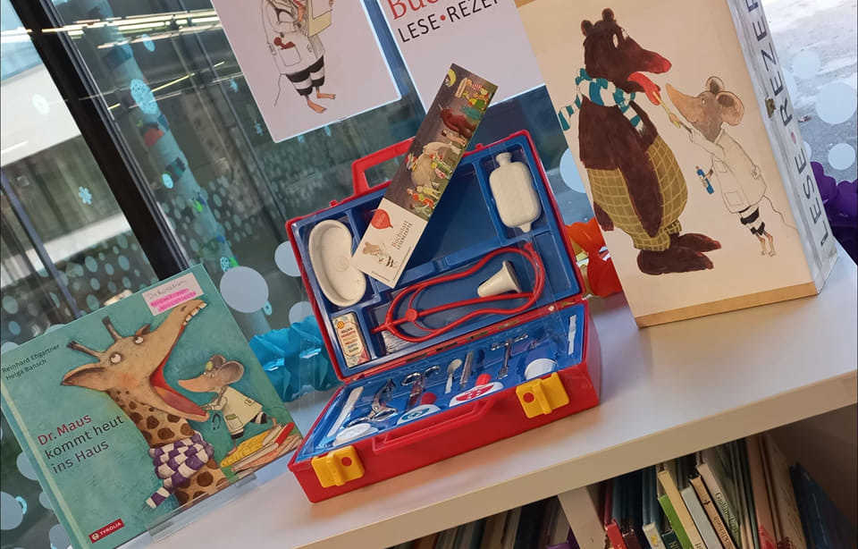 Rosi Schmid, die das Projekt „Dr. Maus kommt heut ins Haus“ von Buchstart für die Altenfeldner Bücherei übernommen hat, und ihr Mann Werner haben in vielen Stunden mühevoller und liebevoller Arbeit eine Mäuse-Ordination für eine:n praktische:n Arzt/Ärztin und Zahnarzt/ärztin angefertigt. „Es soll als Anreiz zum Lesen und für Vorlesestunden dienen, die dann im Herbst regelmäßig stattfinden werden“, sagt die Bibliotheks-Mitarbeiterin. Den ganzen Sommer über stellen Gemeindearzt Michael Schober und Zahnarzt Martin Schaubmayr den von ihnen behandelten Kindern bereits Rezepte aus, mit denen unter anderem tägliche Gutenachtgeschichten oder wöchentliche Spieleabende verschrieben werden. Damit können sich die Kleinen in der Bücherei auch Lesetüten abholen – und bei dieser Gelegenheit die große Auswahl an (Vorlese-)Büchern entdecken. Zusätzlich gab es in der "Österreich-liest"-Woche täglich Lesungen für alle Kindergarten-, Volksschul- und ASO-Kinder. Im Rahmen der alljährlichen Buchausstellung fand im November 2022 eine Vorlesestunde zum Dr. Maus-Projekt statt. Versüßt wurde sie mit gebackenen Mäusen und einen Verkauf der Fashion-Mauserl-Fingerpuppen im Anschluss an die Lesung. Regelmäßig finden Märchenstunden statt, die die Mäuseordination als Ausgangspunkt haben. Zusätzlich gibt es sieben handgefertigte Sets "Dr. Maus Rollenspiele" mit Tierfiguren und Beilagentexten für den Verleih. Mit ihnen können verschiedene Situationen und Erlebnisse in der Ordination von Dr. Maus nachgespielt werden. Flankiert wird das alles von einer "Dr. Maus Wochenausgabe", die zur freien Entnahme in der Bibliothek aufliegt und Mäusemärchen und Gedichte enthält. Ein 1,20 m hohes Dr. Maus Modell dient dabei als Ablage. Diese Wochenpost liegt auch in den Ordinationen des Hausarztes und des Zahnarztes auf. Rosi Huber hat die Leserezepte als Abschlussprojekt für ihre Ausbildung zur ehrenamtlichen Bibliothekarin umgesetzt.