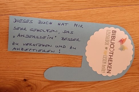 In Anlehnung an eine Idee von Brigitte Weninger wurde in der Bibliothek Helfenberg eine LESEGLÜCK-Apotheke eingerichtet. Ein freigeräumtes Regal wird mit LESEGLÜCK beschriftet. Die Besucher:innen und Mitarbeiter:innen sind eingeladen, Bücher auszuwählen und in die LESEGLÜCK-Apotheke zu stellen. Mit einem besonderen Lesezeichen können sie die ausgewählten Bücher auch kurz beschreiben.