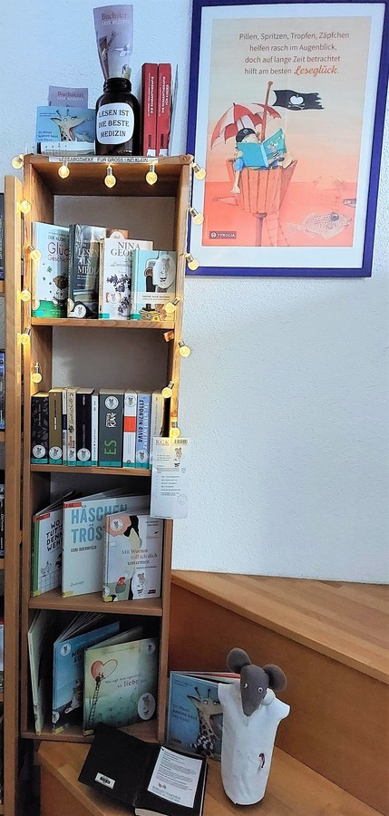 Gleich beim Eingang hat die Bibliothek Weyregg ihre Erste Hilfe Präsentation mit starken Büchern für Herz und Kopf platziert. Die „Buch-Stützen“ bei Themen wie Angst, Trauer und Unsicherheit sind Buchempfehlungen des Teams und müssen nicht unbedingt Neuerscheinungen sein. Zu den (nur positiven) Nebenwirkungen fragen Sie die/den Bibliothekar:in!