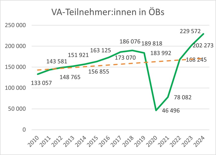 Wie wichtig die soziale Komponente der Büchereien ist, zeigen die steilen Kurven der Veranstaltungen und Teilnehmer:innen (siehe Grafik). Die Trendlinien (orange) zeigen, dass Corona nur eine Delle war und sich der Anstieg ungebrochen fortsetzt.