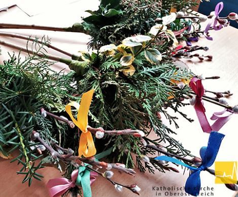 - Palmzweige (Anleitung zum Binden von traditionellen Palmbuschen) Sie können aber auch jegliche grüne Zweige verwenden oder diese aus grünen Papier basteln oder zeichnen).