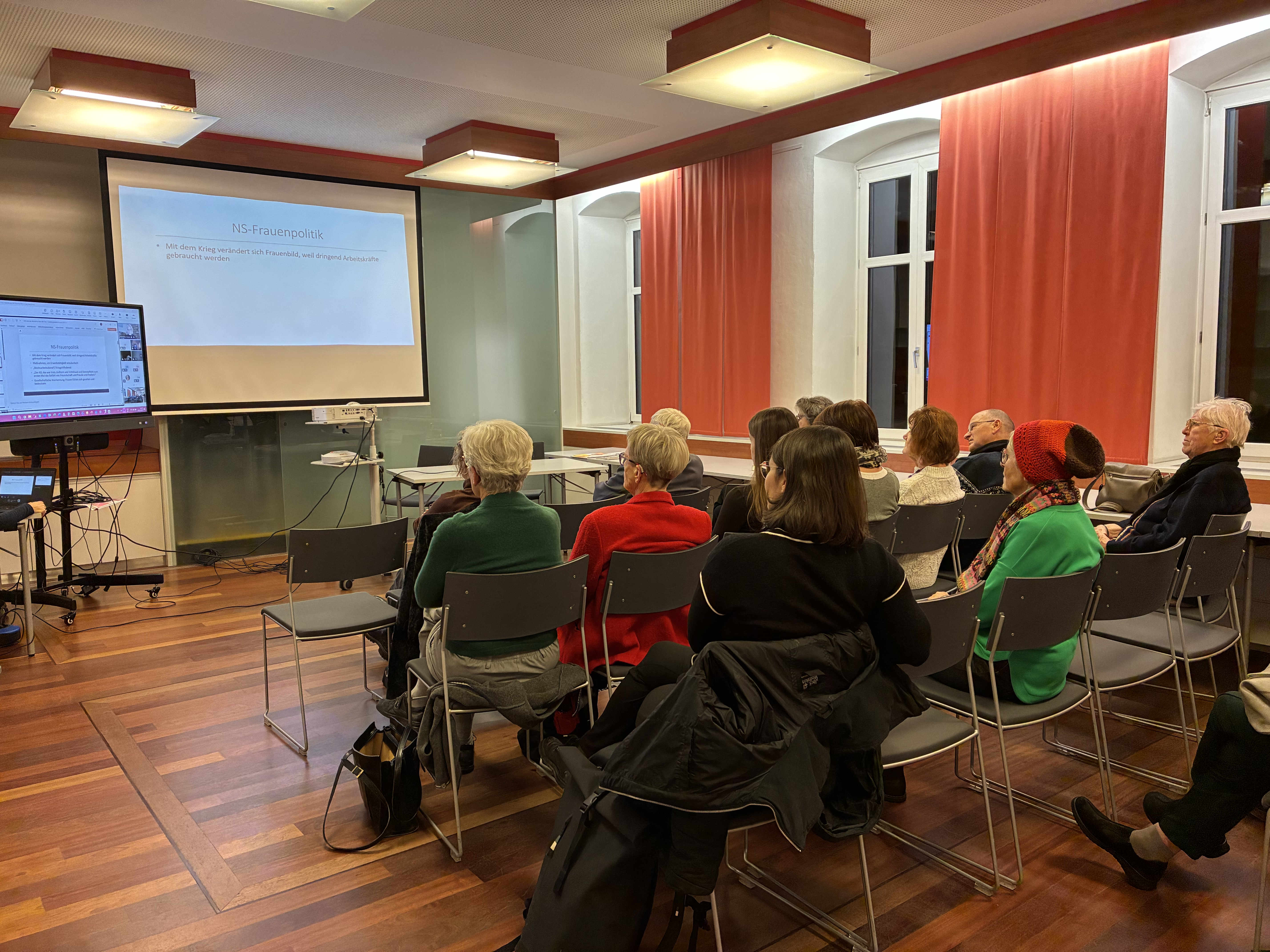 Nach dem interessanten und aufschlussreichen Vortrag von Maria Ecker-Angerer sprach sie mit Christine Haiden und Martin Kranzl-Greinecker über die den Frauen zugewiesenen Rollen und die Instrumentalisierung von Frauen. Auch die Fragen der Kontinuitäten im Haus und der Gesellschaft wurde besprochen. Außerdem wurde auf die wichtige Tatsache hingewiesen, dass nicht allen Frauen vom NS-Regime ein hoher Stellenwert zugeschrieben wurde. Viele Frauen trafen aufgrund der rassistischen Ideologie, oder weil sie als politisch nicht zuverlässig galten auf die rohe Gewalt der Nationalsozialisten. So hat die Veranstaltung an einem sehr wichtigen Tag stattgefunden. Am 25. November beginnen jährlich mit dem Internationalen Tag zur Beseitigung von Gewalt gegen Frauen die Aktionstage 16 Tage gegen Gewalt gegen Frauen. Sie erinnern uns daran, Gewalt an Frauen in der Vergangenheit und der Gegenwart aufs stärkste zu verurteilen und alles dafür zu tun, sie in Zukunft zu verhindern.