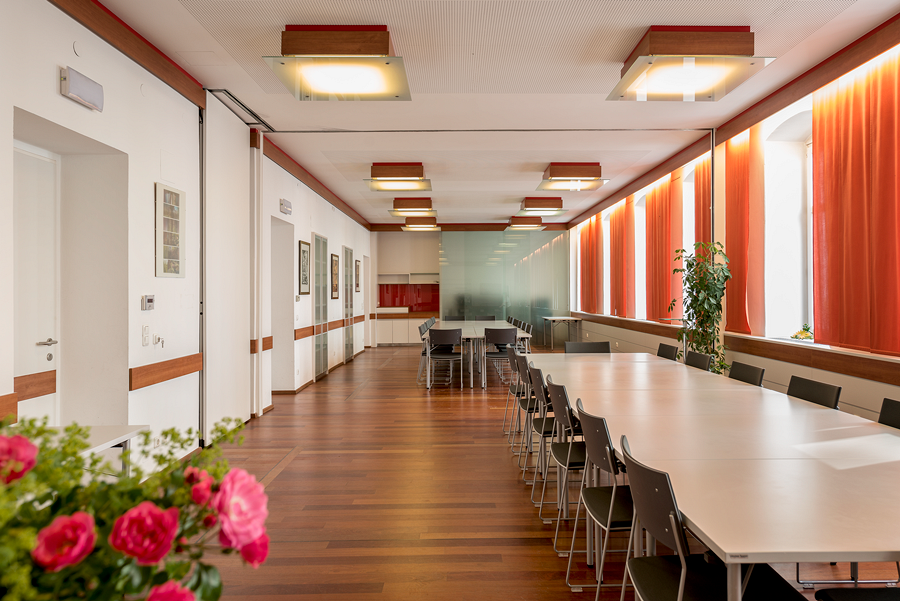 Folgende Bestuhlung ist möglich: Kinobestuhlung, U-Form, Vorlesung/Schule, Tischkreis, Sesselkreis mit Tischen an der Wand
