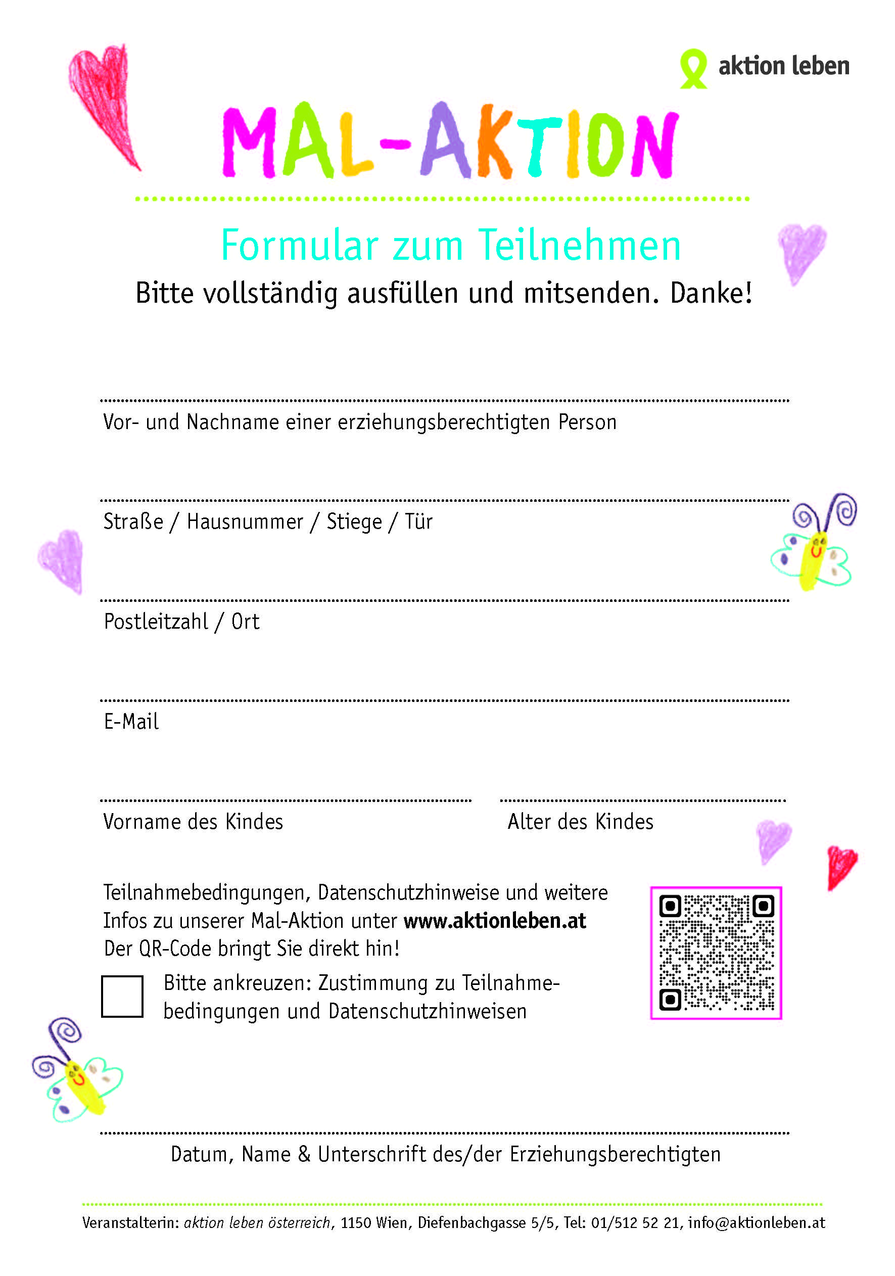 - Du schickst das Bild und das ausgefüllte Teilnahme-Formular per Post an aktion leben österreich, Diefenbachgasse 5/5, 1150 Wien oder du fotografierst oder scannst Bild und Teilnahme-Formular ein und schickst es uns per E-Mail an info@aktionleben.at