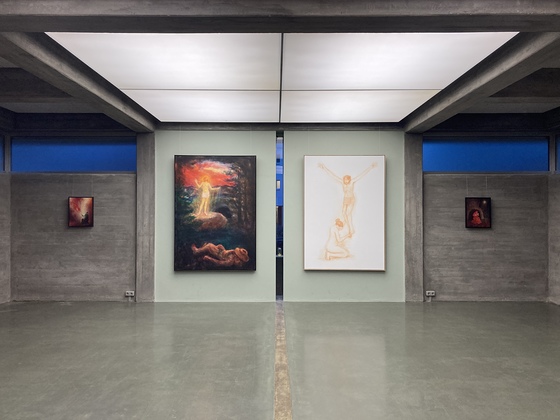 Die kleinformatigen Bilder vor der Sichtbetonwand stellen als „Verkündigung“ und „Geburt“ jeweils Szenen aus dem Marienleben dar.