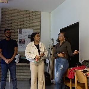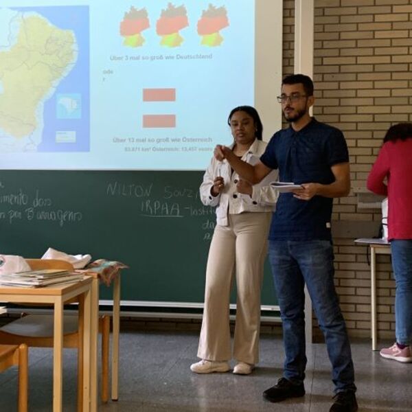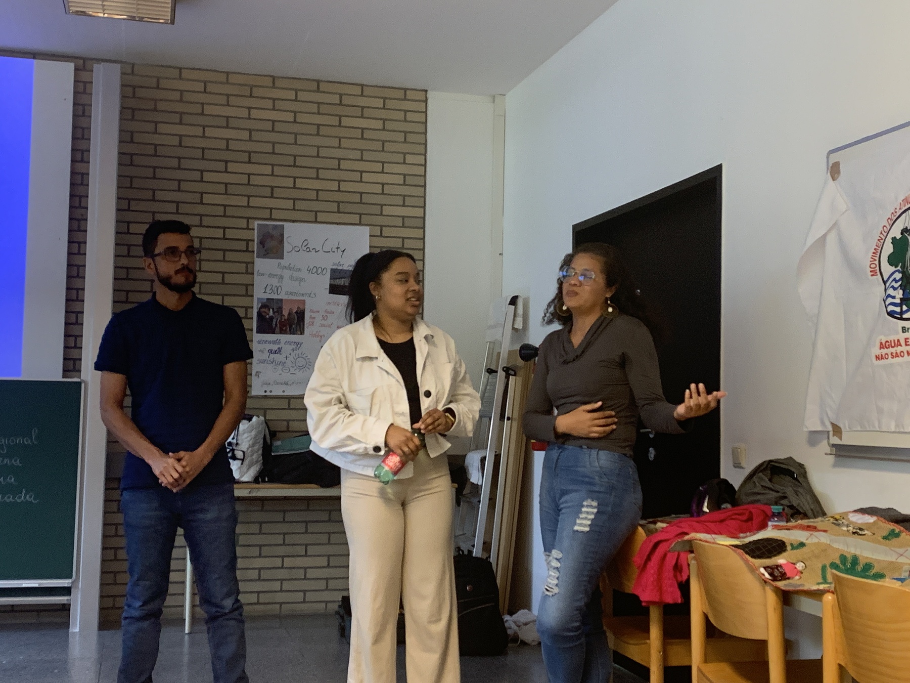 Nilton arbeitet in der Bewusstseinsbildung mit Gruppen, die von großen Staudamm-Projekten betroffen sind. Besonders spannend für die Studierenden war die Präsentationstechnik mit großen Bildern auf Leintüchern. In Brasilien arbeitet Nilton oft in Gegenden ohne Strom und Computer und dafür sind die Bilder einfach zu transportieren und überall zu verwenden.