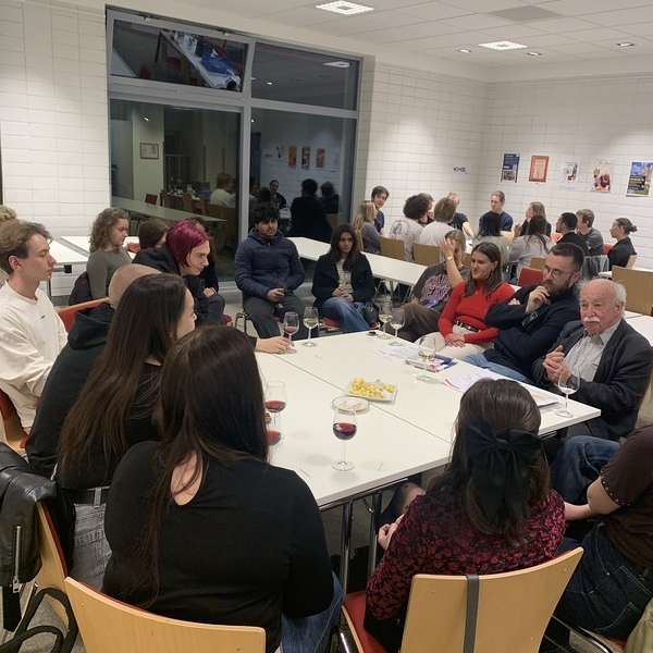 In gemütlicher Atmosphäre bei gutem Käse von der Genussecke Linz Dornach und Wein vom Stift Wilhering fanden sich fast 40 Studierende am Freitagabend (13.3.2026) in der Galerie der KHG ein.