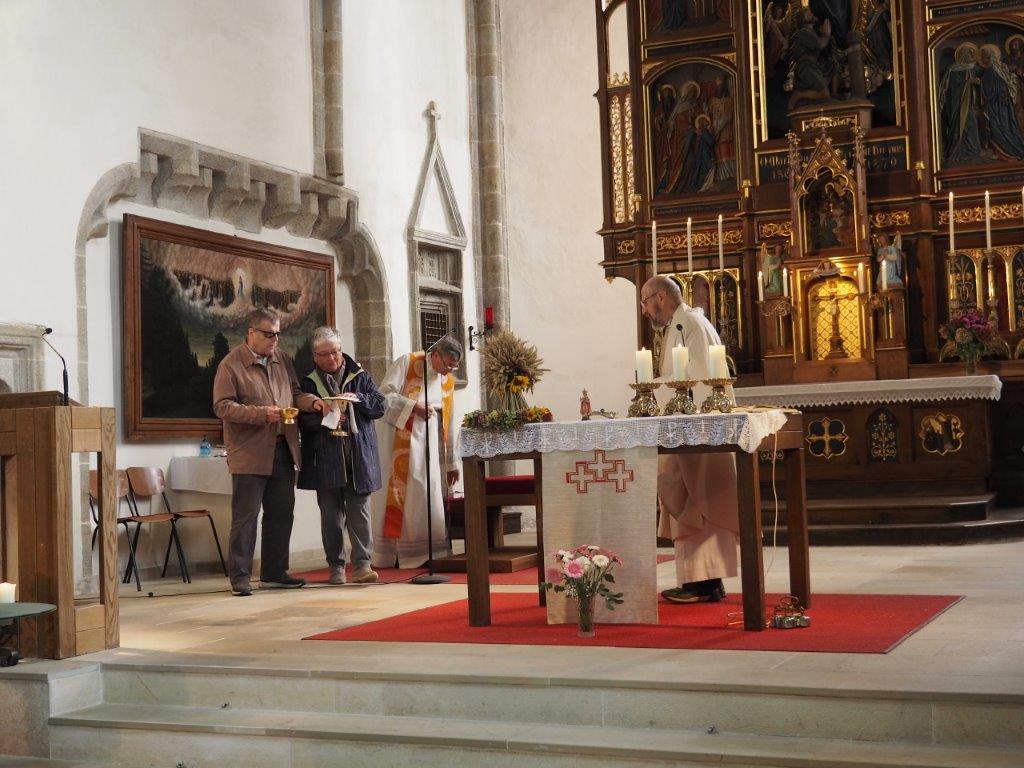 Nachdem die Pilgergruppe von Windhaag bei Perg singend in die Kirche eingezogen waren wurde mit Zelebrant Mag. Josef Michal und Blindenseelsorger Mag. Franz Lindorfer als Konzelebrant die heilige Messe gefeiert. Mag. Michal erzählte auch seine Verbindung zu den Blinden und Sehbehinderten durch den legendären Pater Lutz. Mag. Michal begleitete bei den Blindenfreizeiten, die Pater Winfried Lutz 1971 ins Leben gerufen hat, Blinde und Sehbehinderte bei ihren Wanderungen.