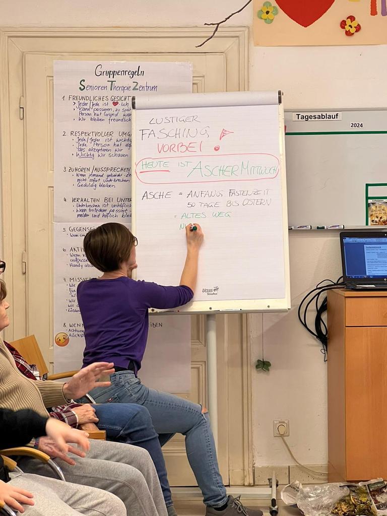 Im Wort „Aschermittwoch“ steckt das Wort „Asche“. Asche hat man früher zum Reinigen genommen und zum Düngen der Blumen. Sr. Elisa und die Gehörlosen haben ein Feuer gemacht. Sie haben die Faschingsdekoration verbrannt. Der Priester hat mit Asche ein Kreuz auf die Stirn gemacht. Das bedeutet: Wir denken über unser Leben nach. Wir wollen umkehren = Gutes tun, zu Jesus beten.