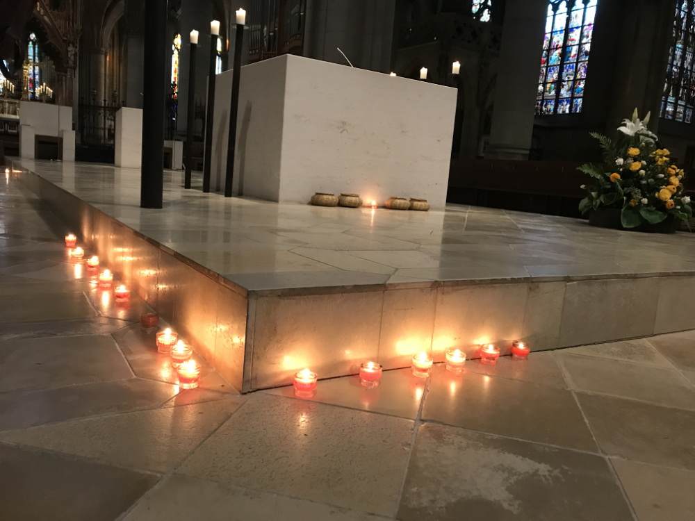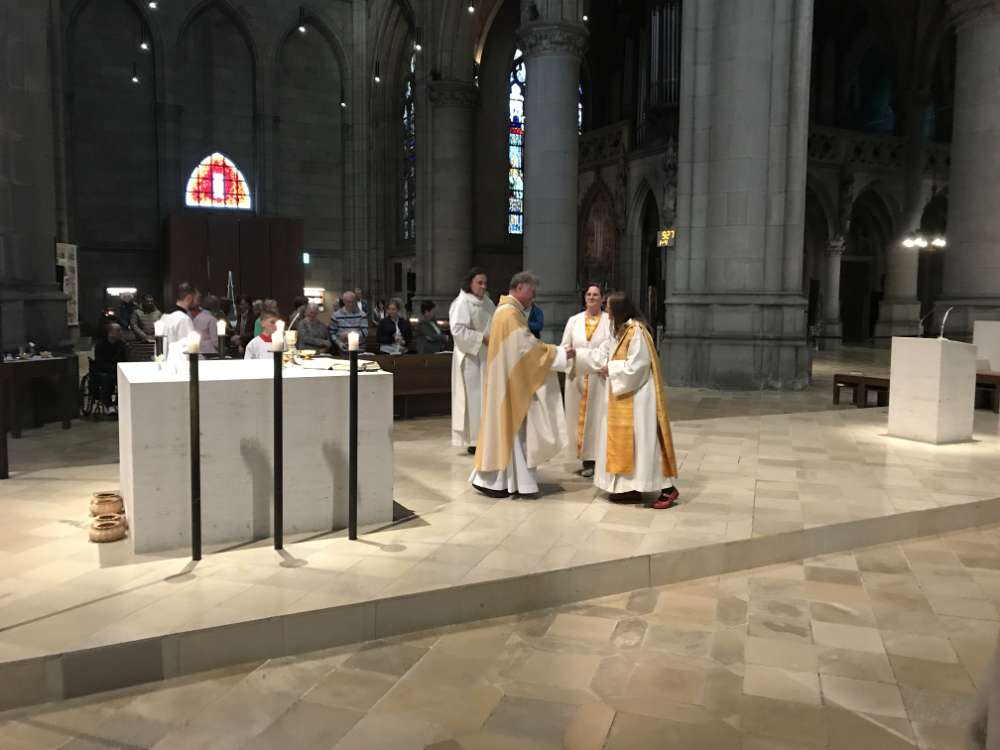 Bei der Gabenbereitung wurden bedeutungsvolle Zeichen zum Altar gebracht: eine offene Hand, ein Kreuz, ein Herz, ein Notenschlüssel und eine Taufkerze – Symbole für das Leben und die vielfältige Arbeit in der Seelsorge.