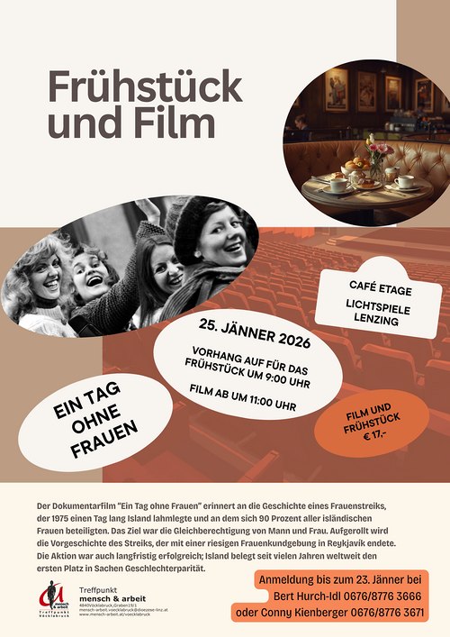 Ab 9.00 Uhr im Café Etage emeinsam frühstücken und anschließend um 11.00 Uhr ins Kino gehen. Heuer haben wir uns für den Film "Ein Tag ohne Frauen" entschieden.