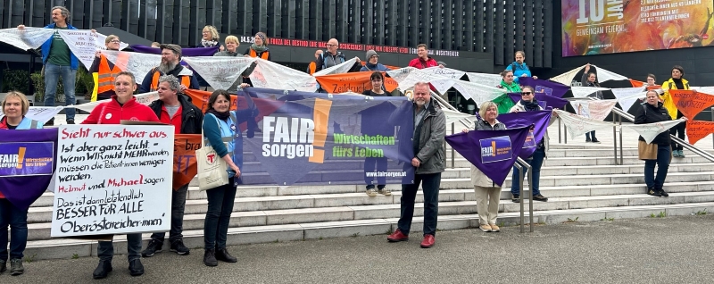 Fair!sorgen OÖ. Mehr für Care-Arbeit Wirtschaften fürs Leben Kundgebung 11.05., 11.05. Verlängerung der Rettungskette: Über 400 Menschen haben sich beteiligt. Gemeinsam knüpfen wir weiter. Studientag Pflege in Bewegung in der AK OÖ. Quintessenz: Essentielle Bedeutung von interdisziplinärem Zusammenhalt und beruflichem Selbstbewusstsein. "Wir sind die coolste Berufsgruppe." "Wir haben ein Talent, das die Welt braucht." Referent Markus Golla Demo Bündnis 8. März zum Internationalen Frauentag 2. Dezember Kundgebung und Rettungskette TPP-Statement mehr: Fair!sorgen OÖ. Mehr für Care-Arbeit