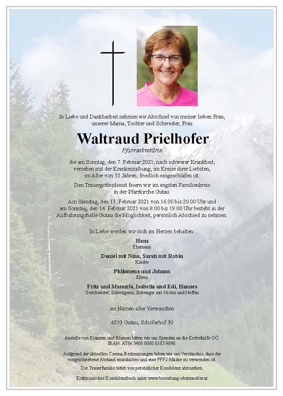 Am 7. Februrar 2021 ist Waltraud Prielhofer, Pfarrsekretärin der Pfarre Gutau, verstorben.