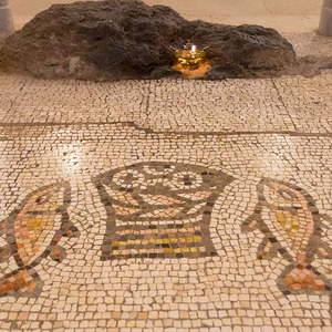 Gleich an unserem ersten Tag am See Genezareth besuchten wir die Brotvermehrungsstelle und hatten hinterher die seltene Gelegenheit, an einer Gebetsstätte in Dalmanuta längere Zeit die Evangelien zu betrachten und das Sakrament der Eucharistie zu feiern. Im Anschluss daran gingen wir einen traditionellen Petrusfisch im Deutschen Pilgerhaus essen. Ich selbst jedoch als "Bekennender" verschmähe jegliche Wasserbewohner zog es vor, mir ein gutes, altbewährtes Schnitzel einzuverleiben. Am Nachmittag stand dann ein Besuch in Magdala an, wo eine Synagoge aus der Zeit Jesu ausgegraben wurde, deren gut erhaltenes Boden-Mosaik unser Jesus selbst betreten haben dürfte.