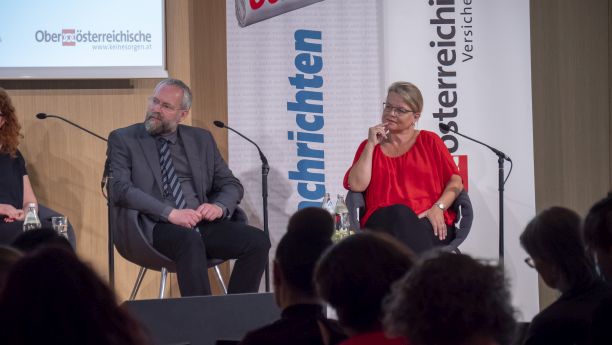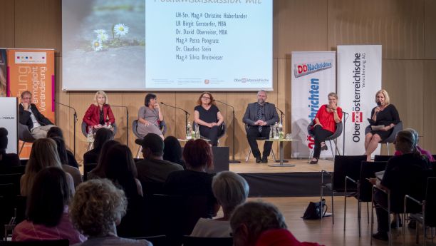 Podiumsdiskussiion mit (v.l): Dr. Claudius Stein, LH-Stv. Mag.a Christine Haberlander, LR Birgit Gerstorfer, Mag.a Petra Pongratz, Dr. David Oberreiter, Mag.a Silvia Breitwieser, Barbara Rohrhofer.