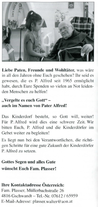 Die Zeitung schrieb: Pater Alfred steigt auf wegen seiner 51 Jahre als Priester. Er ist der Gründer der Kinderdörfer, die seinen Namen tragen. Das Heim nimmt Kinder, die im Stich gelassen, misshandelt oder zu Waisen geworden sind, in Einfamilienhäuser auf, wo sich jedes Kind in einem familiären Klima der Liebe mit einer Mutter und seinen Geschwistern aufrichtet/aufsteht.