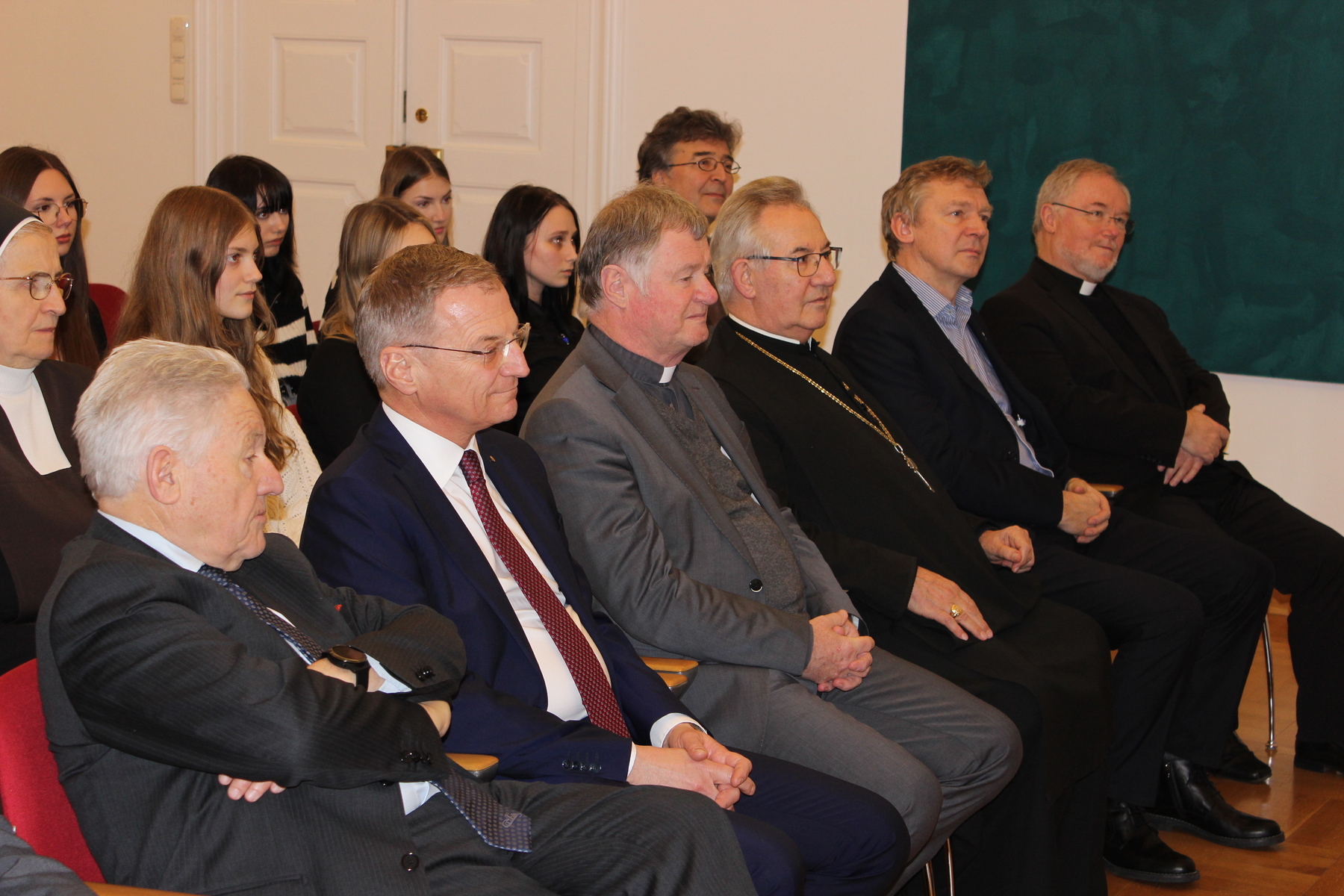 An der Feier im Linzer Bischofshof nahmen neben den Preisträger:innen auch Bischof Manfred Scheuer, Landeshauptmann Thomas Stelzer, Landeshauptmann a. D. Josef Pühringer, Generalvikar Severin Lederhilger, Sr. Michaela Pfeiffer-Vogl (Generaloberin der Marienschwestern vom Karmel und Mitglied im Beirat der Missionsstelle), Sr. Hanna Jurman (Priorin der Benediktinerinnen von Steinerkirchen), Sr. Teresa Hametner (Generalvikarin der Franziskanerinnen von Vöcklabruck), Ambros Ebhart OSB (Abt des Benediktinerstiftes Kremsmünster), der Bischofsvikar für Soziales und Weltkirche Slawomir Dadas, Direktor Herbert Muhr (Mittelschule Neukirchen an der Vöckla), Direktor Klemens Keplinger (Stiftsgymnasium Kremsmünster), weitere diözesane Vertreter:innen sowie Seelsorger:innen und Vertreter:innen der jeweiligen politischen Gemeinde teil.