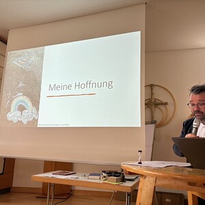 Seinen Impuls schloss Daniel Neubäck mit diesem Hoffnungsbild ab: Den Straßenkreide-Zeichnungen seiner Töchter.