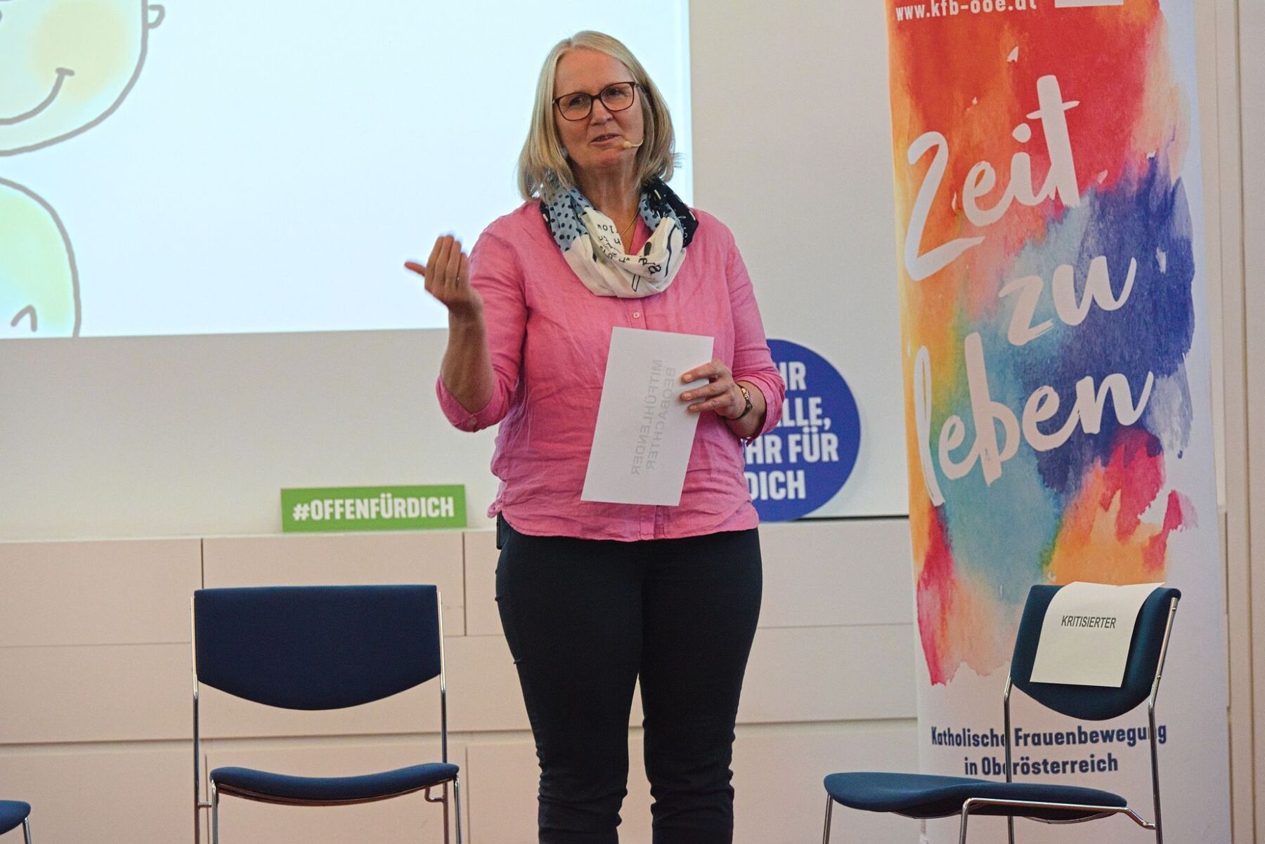 Die innere Kritikerin führt mit abwertenden Glaubenssätzen oft dazu, sich selbst kleinzumachen. Schmidinger ermutigte die anwesenden Frauen dazu, achtsam und freundlich zu sich selbst zu sein und die kritische innere Stimme zu hinterfragen. Sie regte dazu an, positive Glaubenssätze in das eigene Leben zu integrieren, zB "Du bist gut genug", "Du bist wertvoll", oder "Du kannst das".