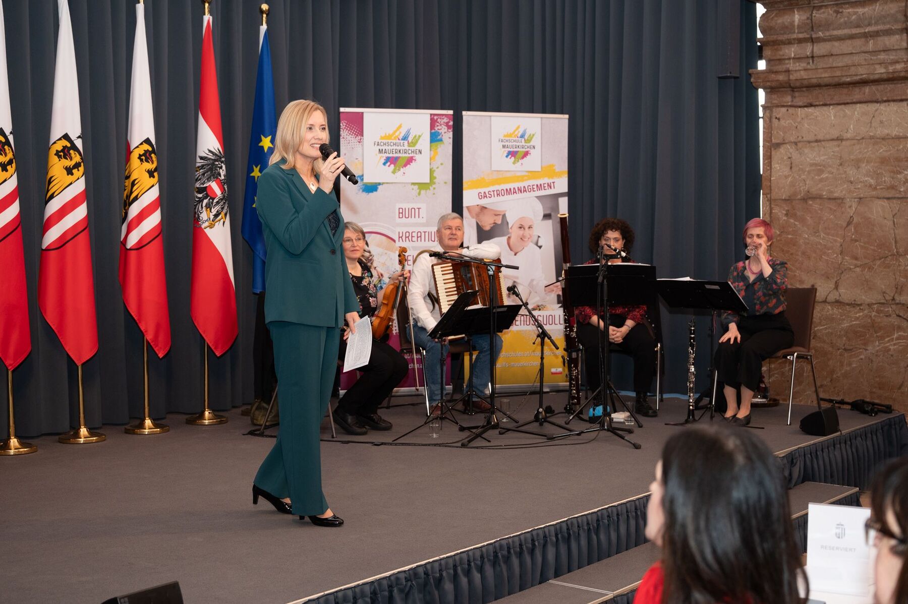 V. l.: Fachlehrerin Andrea Ertl, Direktorin Adelheid Burtscher-Zauner (Fachschule Mauerkirchen), Landeshauptmann Thomas Stelzer, Margit Schmidinger (ehrenamtliche Vorsitzende der Katholischen Frauenbewegung in OÖ), Bischof Manfred Scheuer und Michaela Leppen (Leiterin des Teams Frauen in der Diözese Linz/kfb oö) © Thomas Markowetz