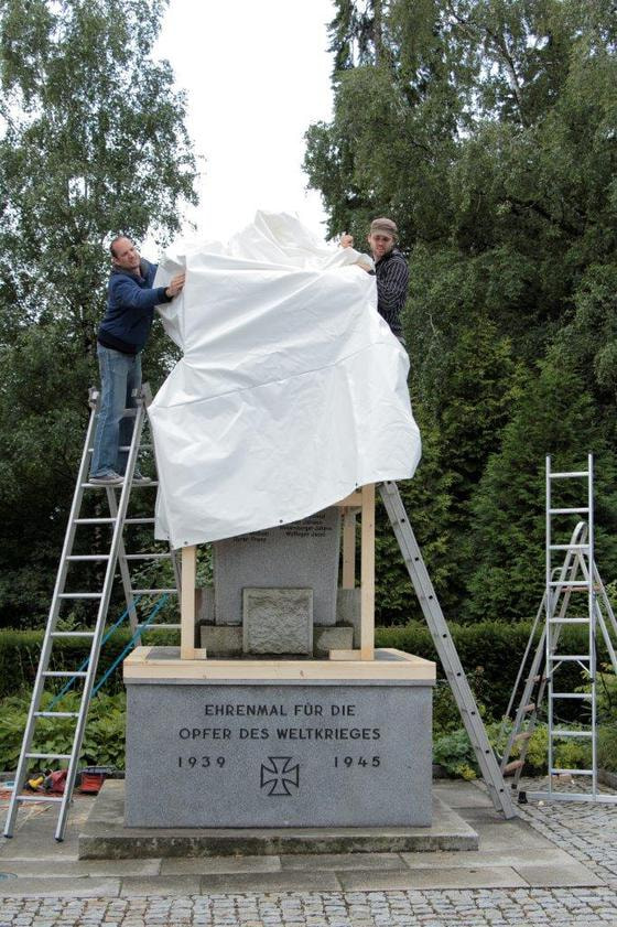 Eine Anforderung an die Künstlerin war die Einbeziehung des bestehenden Kriegerdenkmals, das als Verweis auf die Geschichte der Erinnerungskultur in Österreich erhalten bleiben sollte. Renate Herter verhüllt in einem dritten Schritt dieses Denkmal für mehrere Monate. Die durch ihren Eingriff veränderte, skulpturale Form sowie das Weiß des Materials schaffen eine Verfremdung, fordern heraus und regen zahlreiche Debatten an. Die „Abwesenheit“ des Kriegerdenkmals lässt plötzlich viele Fragen nach einem zeitgemäßen Opfer- und Täterbegriff aufkommen.