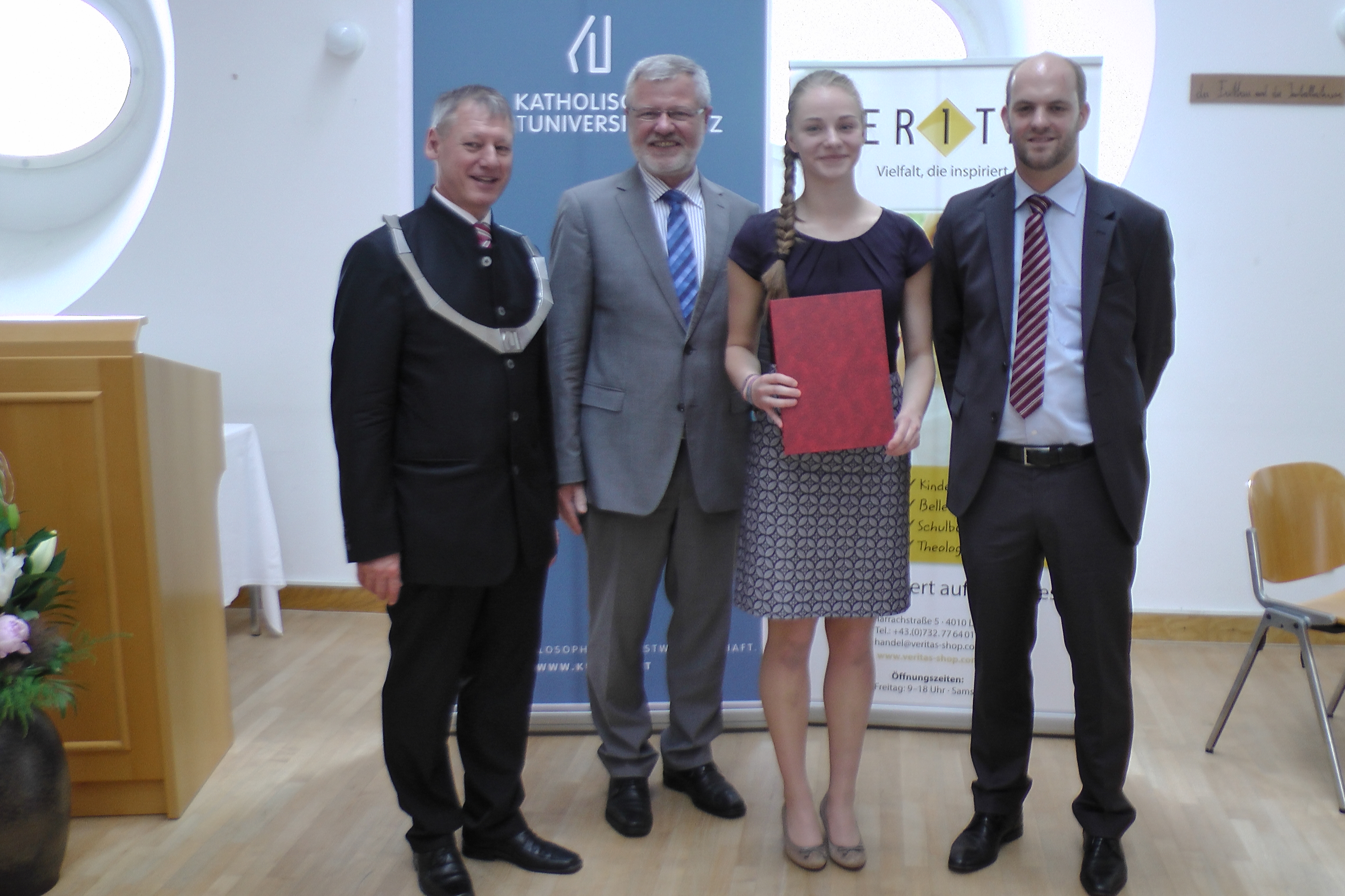 2016-07-02 Katholische Privat-Universität Linz, Foto von der feierlichen Überreichung des mit 500 Euro dotierten KUL-Preises durch den Rektor der Katholischen Privat-Universität Linz, Univ.-Prof. Dr. Franz Gruber und den Direktor des Bischöflichen Schulamtes der Diözese Linz, HR Mag. Franz Asanger, an Sibylle Maria Steinkellner, in Begleitung ihres Betreuungslehrers Mag. Paul Nedwed