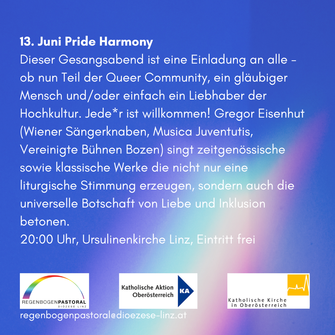 Dieser Gesangsabend ist eine Einladung an alle - ob nun Teil der Queer Community, ein gläubiger Mensch und/oder einfach ein Liebhaber der Hochkultur. Jede*r ist willkommen! Gregor Eisenhut (Wiener Sängerknaben, Musica Juventutis, Vereinigte Bühnen Bozen) singt zeitgenössische sowie klassische Werke die nicht nur eine liturgische Stimmung erzeugen, sondern auch die universelle Botschaft von Liebe und Inklusion betonen.