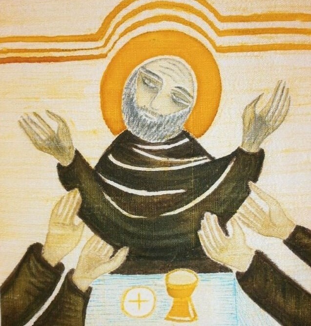 In memoriam Bischof Maximilian Aichern Der Heimgang des heiligen Benedikt Ausschnitt aus einer Stola Handbatik mit Seidenmalerei mehr: In memoriam Bischof Maximilian Aichern