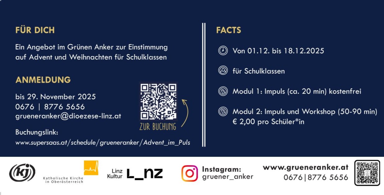 Von 01.12-18.12.2025 findet im Grünen Anker ein Advent im Puls unter dem Titel "Weihnachts Friede" für Schulklassen und Firmlinge statt. Der Impuls ist kostenfrei und dauert ca. 20 Minuten damit er gut in einer Unterrichtseinheit (mit An- und Abreise) stattfinden kann.
