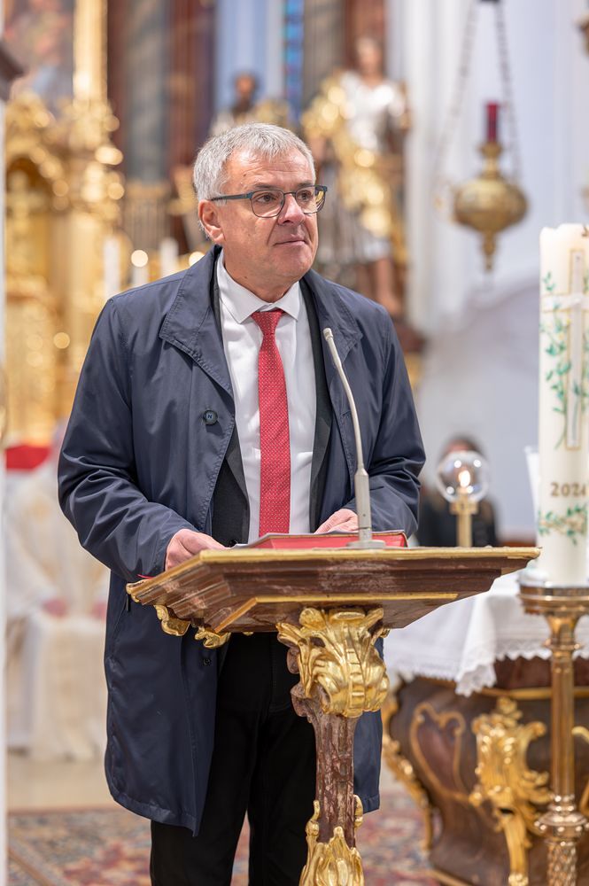 Am Ende des Gottesdienstes sprach der Bezirkshauptmann von Grieskirchen-Eferding Christoph Schweitzer – auch in Vertretung seines Schärdinger Amtskollegen Florian Kolmhofer ein Grußwort. Schweitzer betonte: „Wenn sich 14 Pfarrgemeinden zur einer neuen, großen, bezirksübergreifenden Pfarre zusammenschließen, dann ist ein guter Grundstein für eine gute gemeinsame Zukunft gelegt.“ Gerade in Zeiten der Veränderung sei das Miteinander in der neuen Pfarre ein Prozess, „der mit Blick auf das Gemeinsame und unter Wahrnehmung der Verantwortung gut geeignet ist, zukunftsfit zu werden“. Schweitzer unterstrich auch die Bedeutung einer regionalen und dezentralen Pastoral in den Pfarrgemeinden. Es sei bekannt, dass strukturelle Veränderungen Unsicherheit auslösten, so Schweitzer, aber: „Seien wir offen für Neuerungen, denn sie bieten immer auch eine große Chance, die wir gemeinsam nutzen wollen. Wenn wir dabei ein wenig helfen können, so tun wir das gemeinsam mit den Gemeinden sehr gern.“ Der Bezirkshauptmann schloss mit guten Wünschen für den Pfarrer, die Pfarrvorständinnen und die ganze Pfarre: „Wir wünschen euch allen viel Freude und Erfolg beim Schreiben dieses neuen Kapitels der Pfarrgeschichte!“