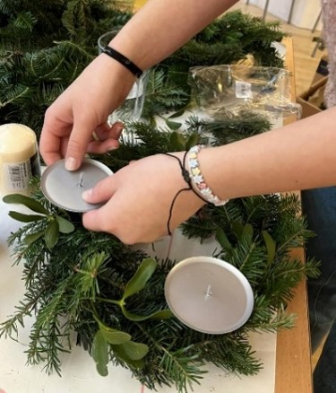 In der Woche vor dem ersten Advent wurden auch dieses Jahr wieder gemeinsam Adventkränze gebunden und dabei eine warme und festliche Atmosphäre geschaffen. Die Kerzen, Kranz und Deko besorgte das Team und das Reisig spendete uns unsere liebe Dorothy. Larissa hatte bereits Erfahrung und konnte die Jugendlichen dabei anleiten, wie man einen Kranz bindet. Auch der farbenfrohe Gewölbe-Adventkranz war wieder eine Eigenproduktion. Bei allen Jugendlichen zeigte sich eine natürliche Begabung fürs Binden und wir freuen uns, dass diese traditionelle Handwerkskunst auf so heimeligem Wege an die nächste Generation weitergegeben werden kann.