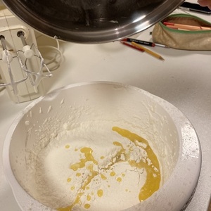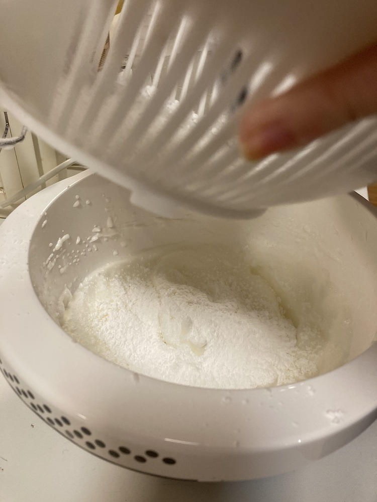 So haben wir begonnen, Kreise auf ein Backpapier zu malen, damit der Teig später die typische Form erhält. Nachdem der Eischnee mit Staubzucker aufgeschlagen war, kamen noch Mehl, Salz, Vanillearoma und die zuvor geschmolzene Butter hinzu, alles wurde gut verrührt und kurz stehen gelassen. Anschließend haben wir die Masse in die vorab gemalten Kreise gestrichen und für ein paar Minuten in den Backofen geschoben.