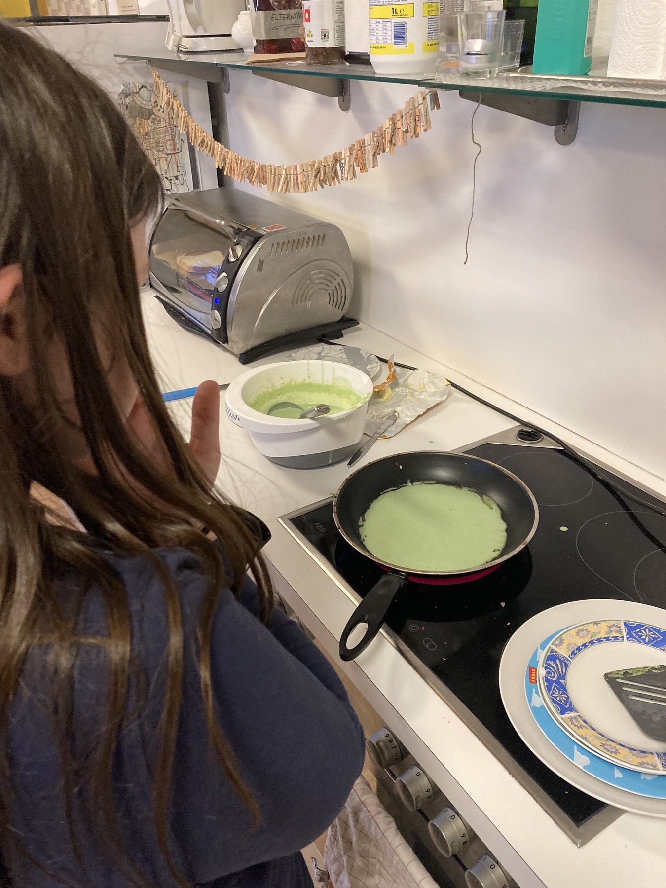 Da eine größere Menge von den Zutaten überblieb, wurde in den folgenden Betrieben, wenn es gerade gepasst hat, Palatschinken gemacht - natürlich als Erinnerung auch grün!
