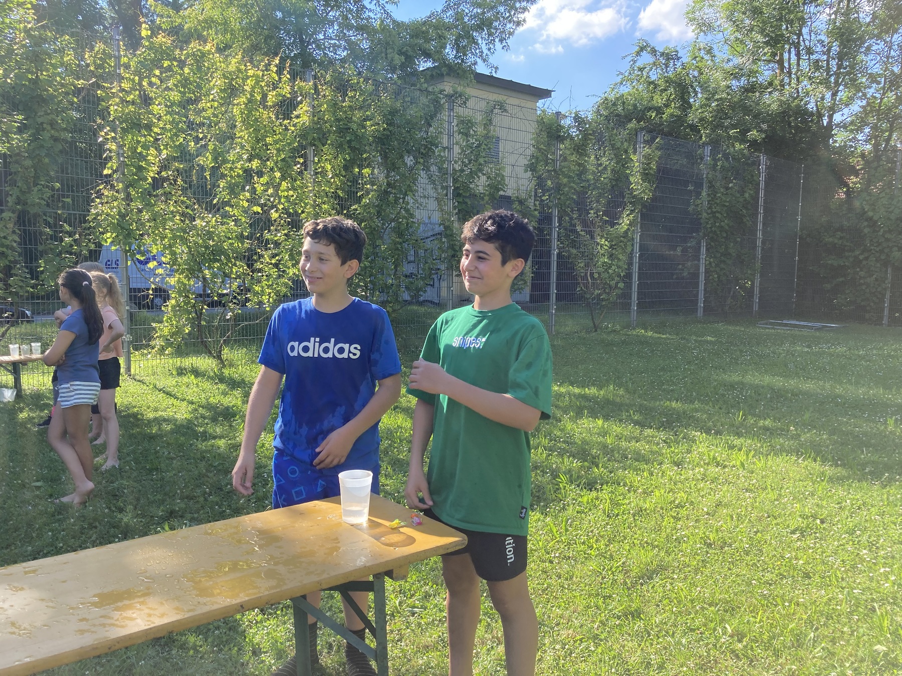 Vor dem anstehenden Regenwetter wollten wir das schöne, warme Wetter noch mit einer Wasserchallenge nutzen. So bereiten wir kleine Spiele im Käfig vor und bildeten größere und auch kleinere Teams, die jeweils gegeneinander antraten.