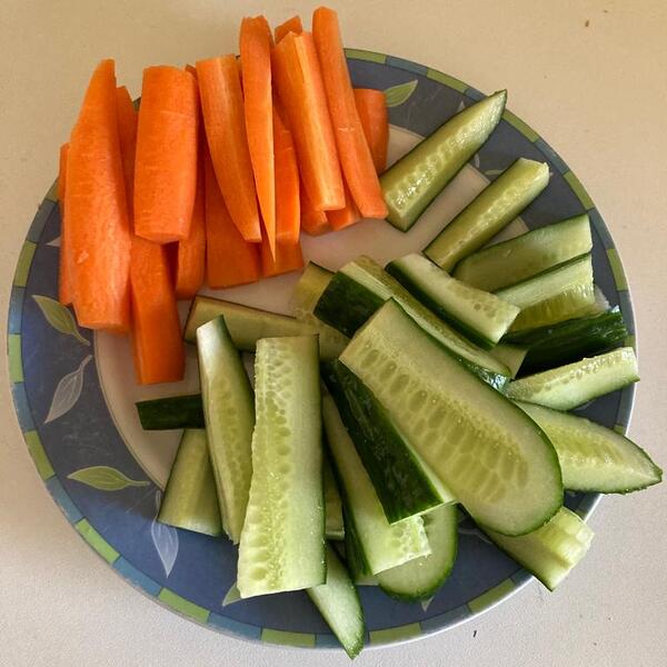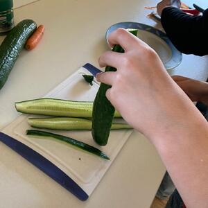 Im Vorfeld haben wir Karotten, Paprika und Gurken besorgt, die anschließend im Betrieb von den Kids fleißig zu Sticks verarbeitet wurden. Aus Joghurt, Kräutern und Zitrone wurde ein Dip gemischt, der schließlich gemeinsam mit den Gemüsesticks verputzt wurde. Viele Kids halfen in der Zubereitung und noch mehr ließen sich die Snacks schmecken - die Gemüsesticks waren also ein voller Erfolg!