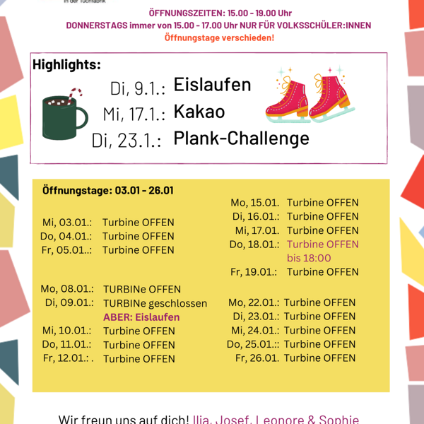 ... Am 9.1. wird es sportlich - wir gehen Eislaufen. Am 17.1. gibt es Kakao zum Aufwärmen bei den winterlichen Temperaturen. Am 23.1. machen wir eine sportliche Plank-Challenge zum Abschluss des Monats.