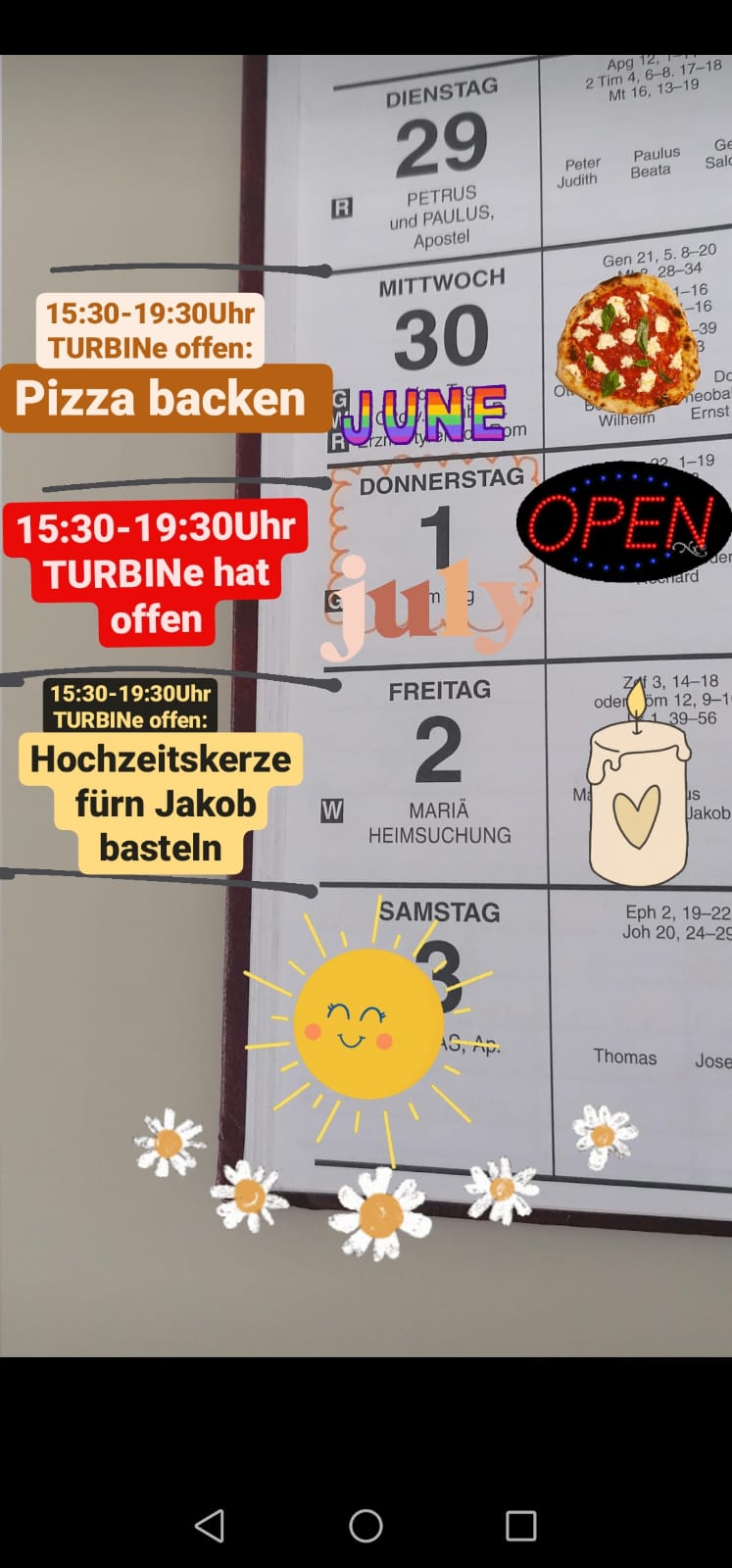 Am Mittwoch wird gemeinsam Pizza gebacken und am Freitag die Hochzeitskerze für Jakob gebastelt!