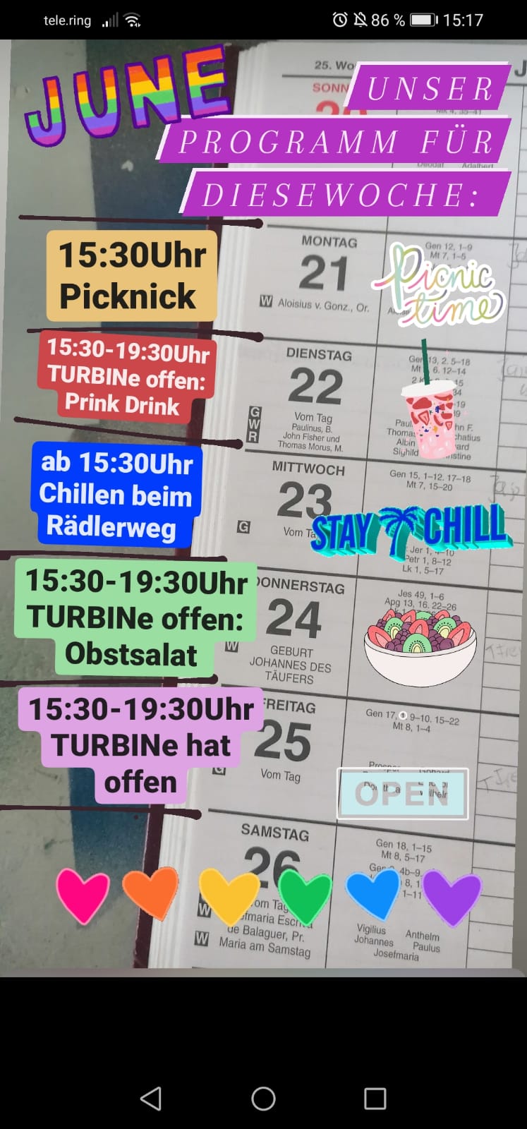 In dieser Woche sind wir picknicken beim Rädlerweg und machen gemeinsam den Pink Drink. Außerdem gibt es am Donnerstag einen leckeren Obstsalat.