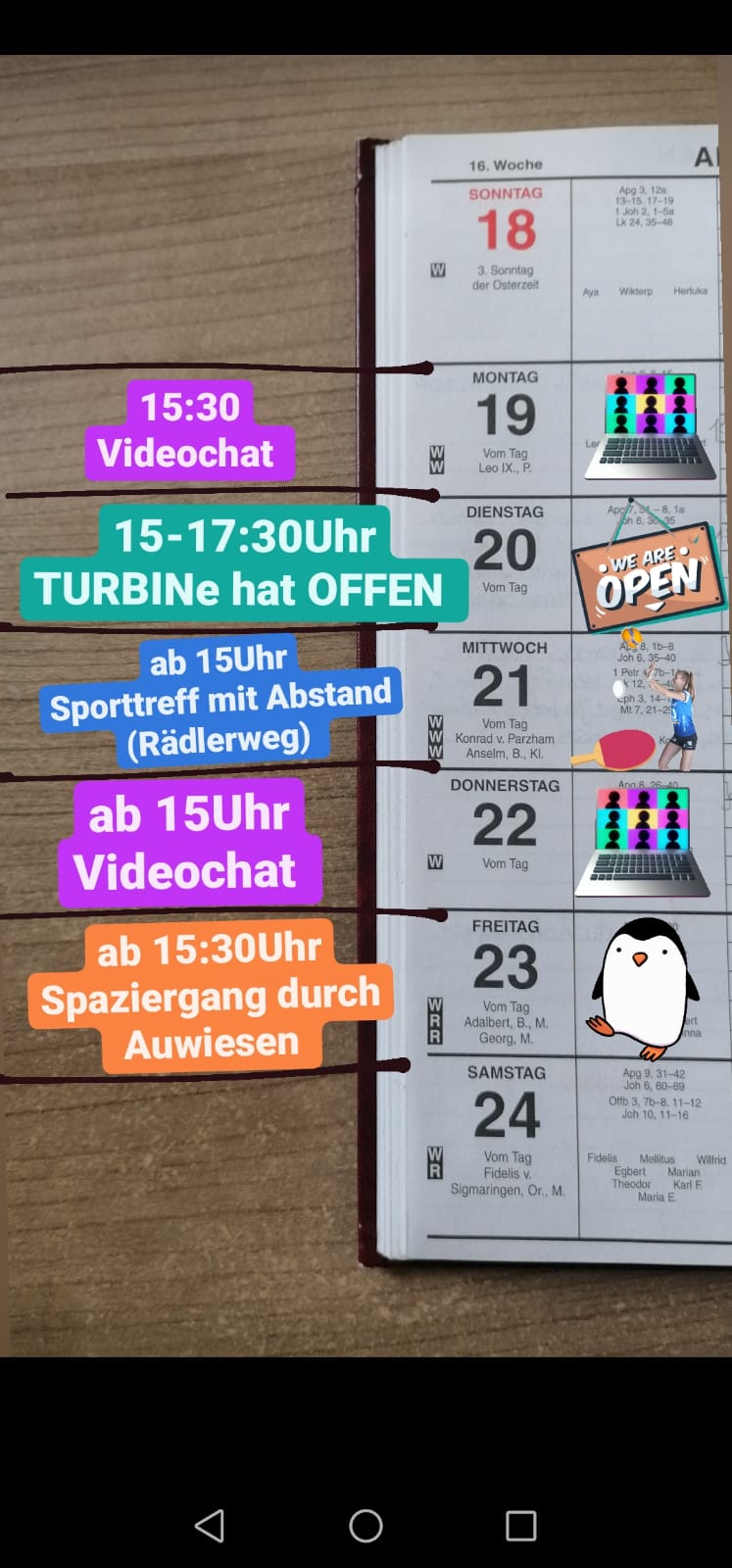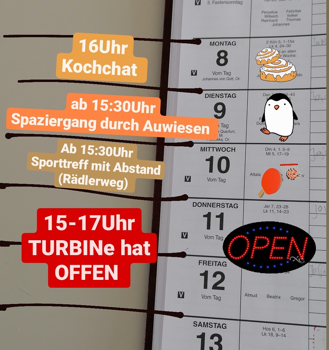 Diese Woche stehen 2 Videochat mit dem TURBINe-Team auf dem Programm. Am Dienstag sind wir dann im Stadteil Auwiesen unterwegs und am Freitag (bei Schönwetter) findet ihr uns zum Sporteln beim Rädlerweg. Mittwoch ist wieder ein Öffnungstag zu den bekannten Regeln. Schaut vorbei und meldet euch mal!