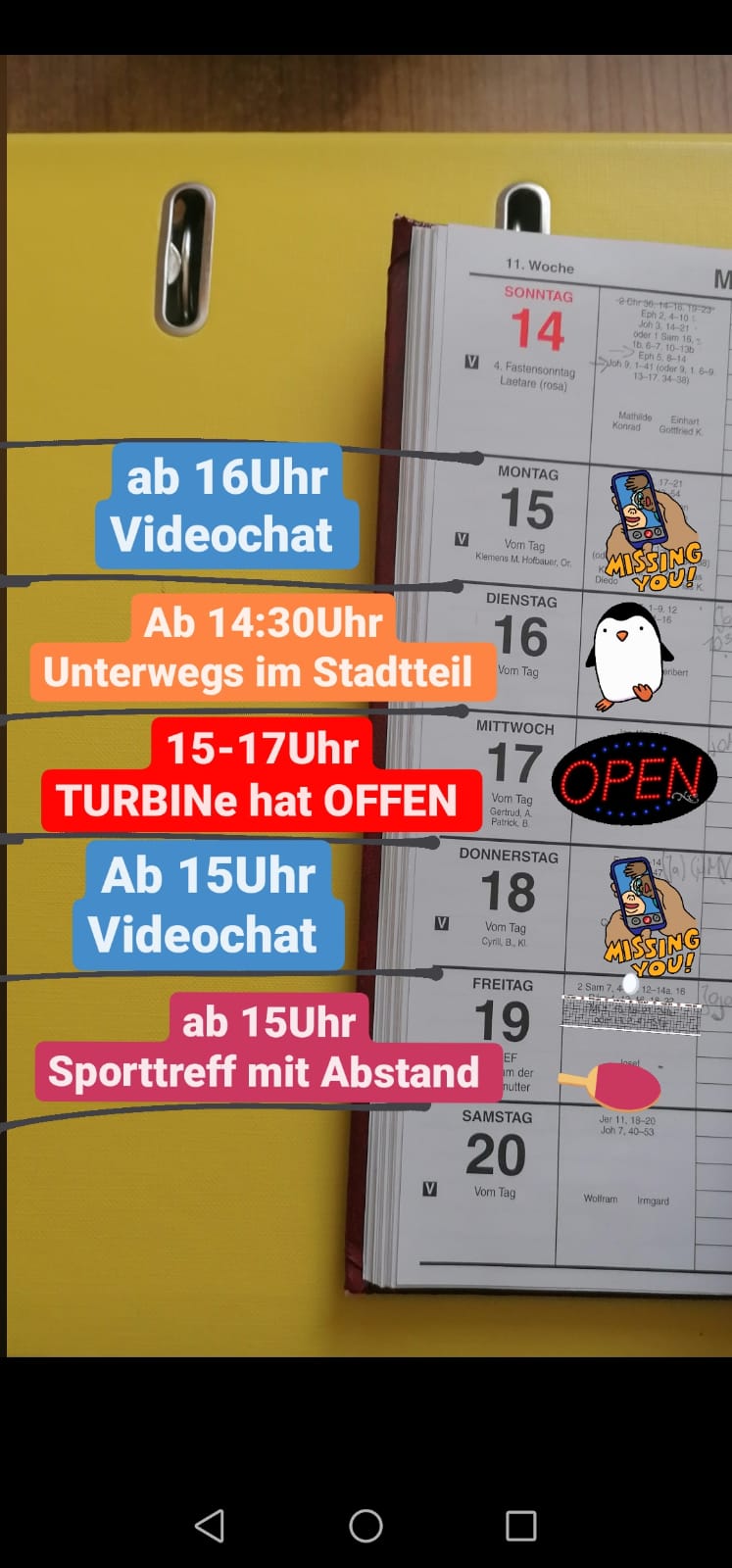 Wir starten in die 1. Osterwoche mit einem Videochat. Mittwoch haben wir wieder einen Öffnungstag. Donnerstag und Freitag sind wir im Stadteil unterwegs. Am Samstag könnt ihr euch auf ein spannendes TURBINe-Betreuer-Quiz auf Instagram und Facebook freuen.