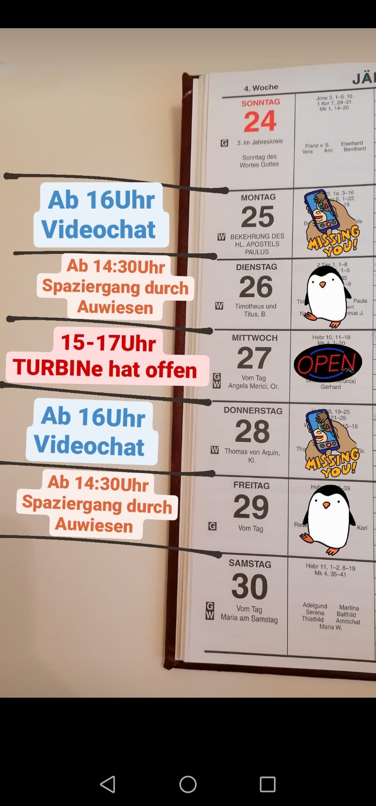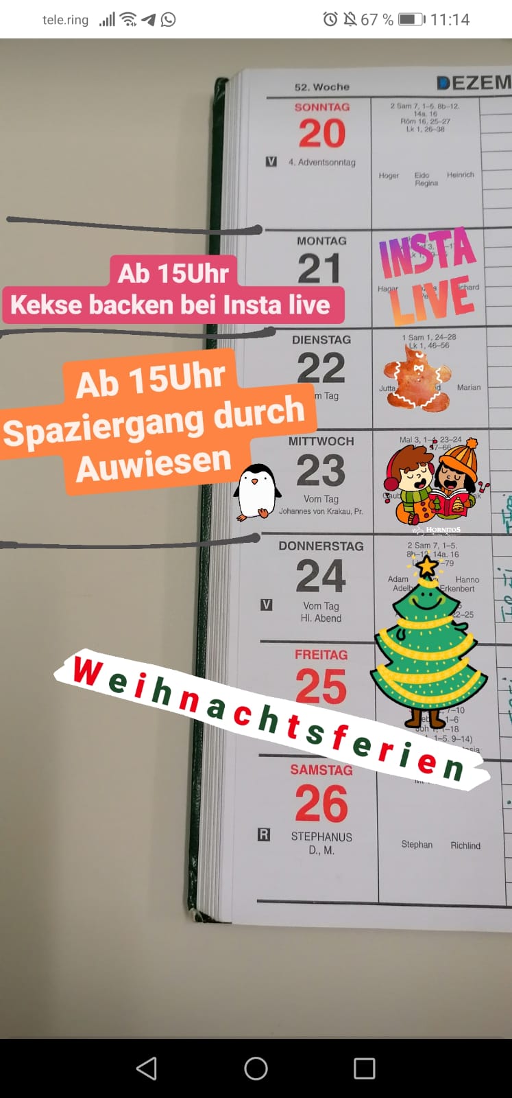 Die restliche Woche gibt es wieder Videochats und unsere Spaziergänge durch Auwiesen.