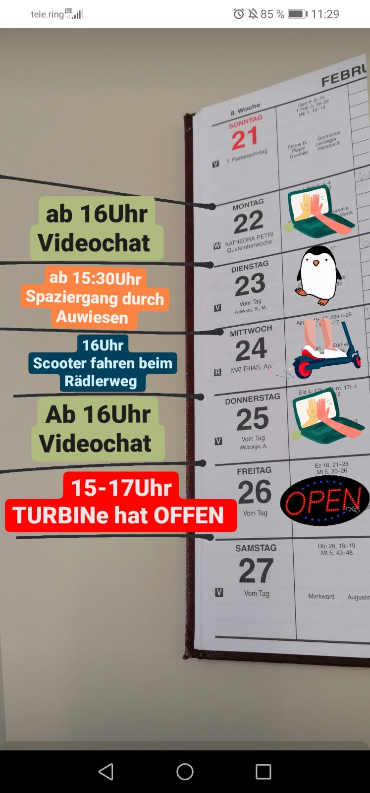 Weiter geht es in dieser Woche mit den bekannten Videochats der TURBINe und den Spaziergängen im Stadteil. Wir nutzen auch das schöne Wetter und deshalb findet ihr uns am Mittwoch am Skatepark, Scooter fahren. Am Freitag öffnen wir die TURBINe für euch, wenn ihr mal eine Auszeit von daheim braucht.