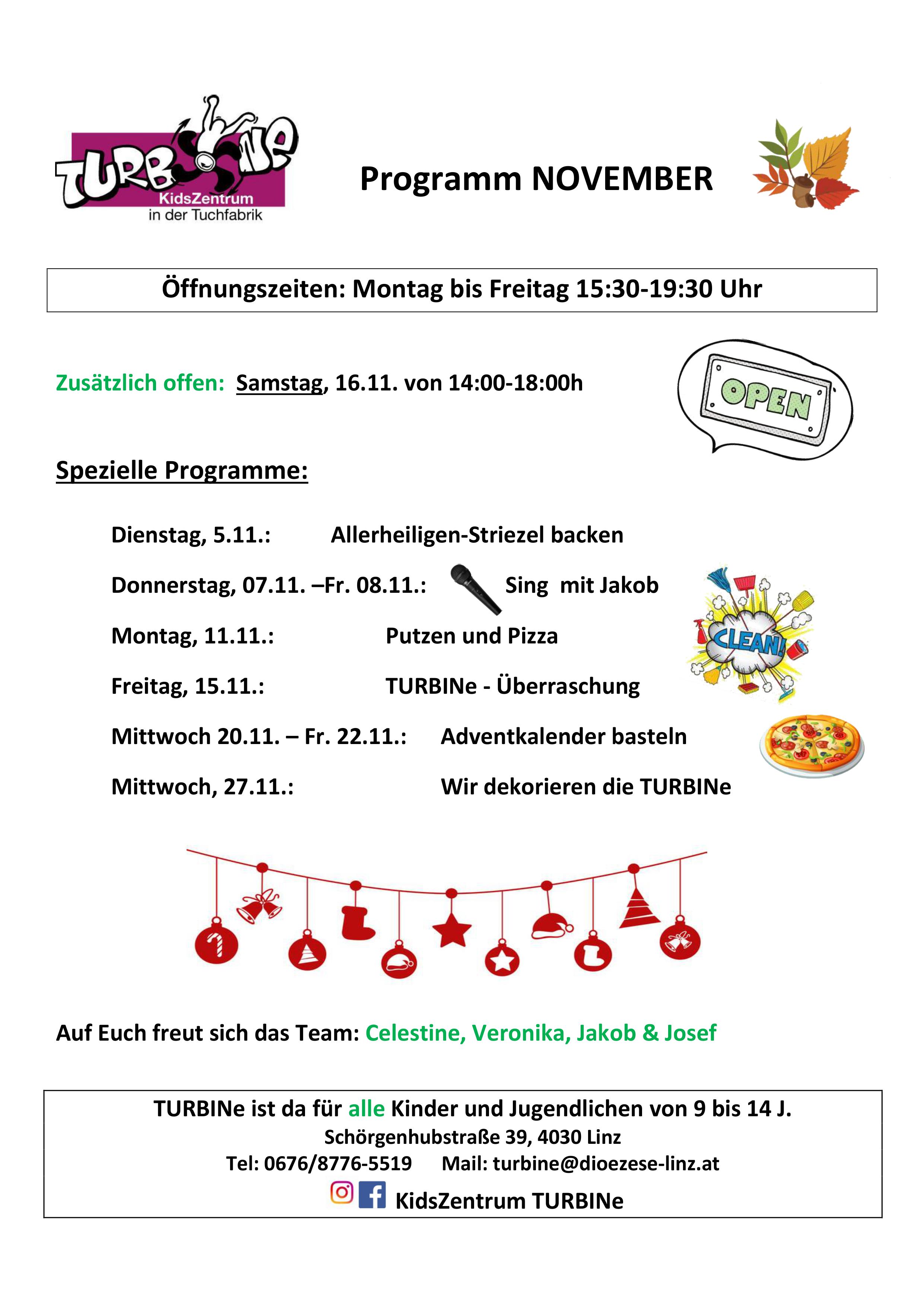 Auch Im November gehts in der TURBINe wieder mit einem tollen Programm weiter. Nach den Feiertagen zeigt euch Veronika, wie man einen Allerheiligen-Striezl backt. Im Laufe der restlichen Woche könnt ihr mit Jakob singen und eure Ideen für ein TURBINe-Lied einbringen. Wie auch im Frühling erwartet euch "Putzen und Pizza" und zu Josefs Rückkehr aus dem Urlaub gibt es eine Überraschung. Bevor der Advent beginnt, basteln wir noch einen Adventkalender und dekorieren die TURBINe. Schaut auf jeden Fall vorbei!