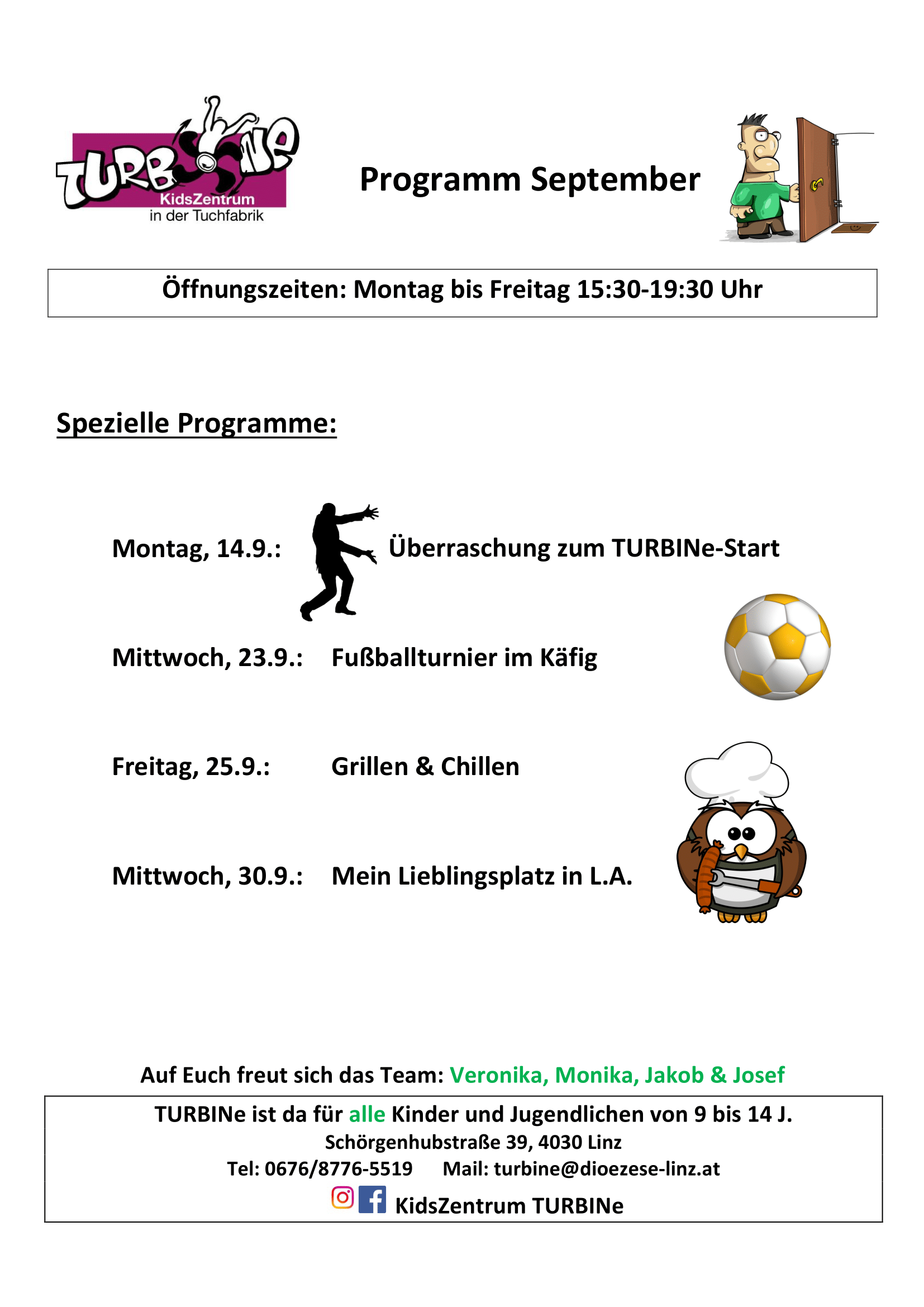 Der TURBINe-Start wird mit einer Überraschung gefeiert, der Käfig zu Fußballstadtion bei unserm Fußballturnier und natürlich wird wieder mal gekocht bzw. gegrillt. Besonders freuen wir uns auf den Programmpunkt "Mein Lieblingsplatz in L.A." Hier kannst du uns deinen besonderen Lieblingsplatz in Linz Auwiesen zeigen und mit uns teilen. Wir sind schon gespannt!