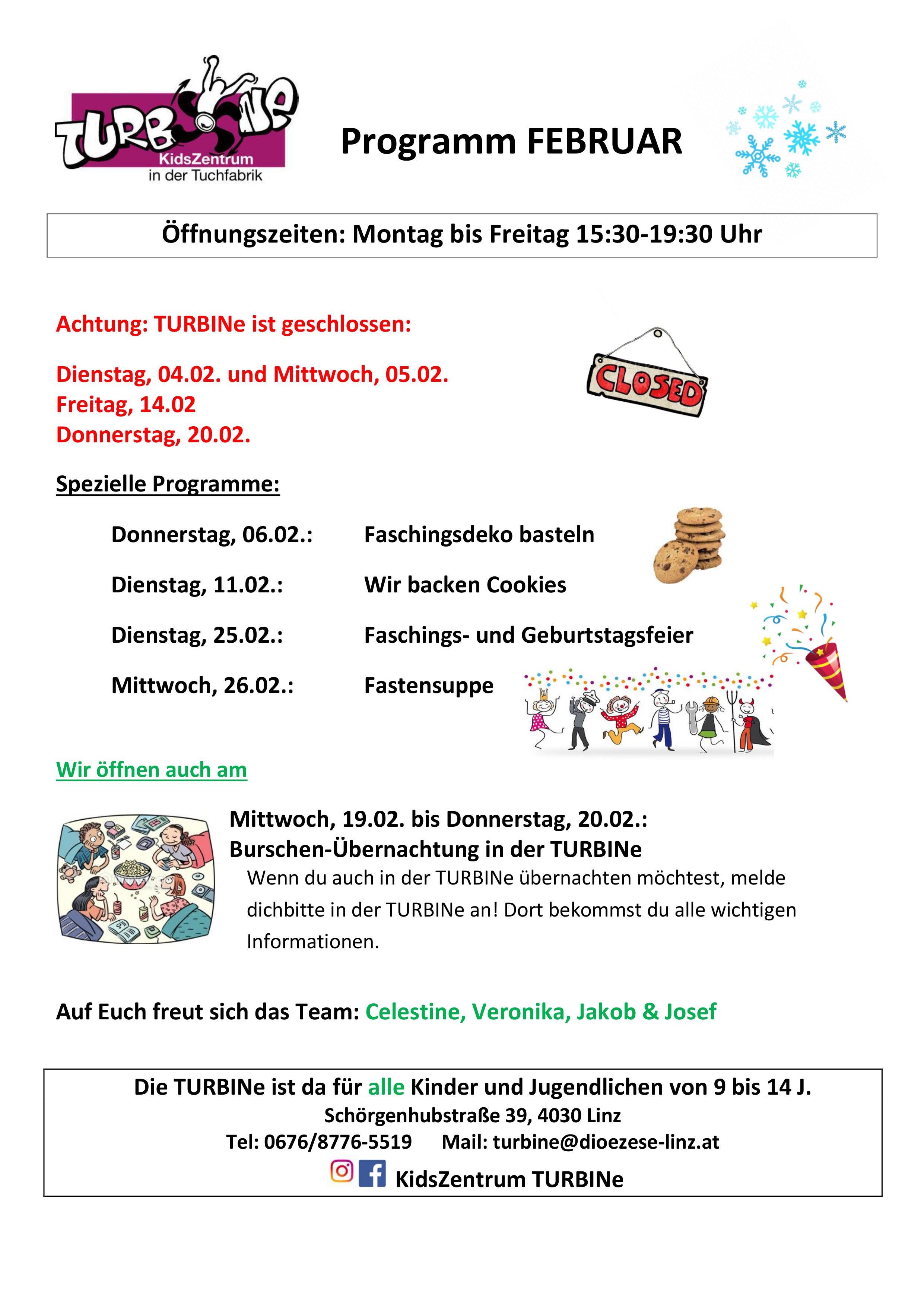 Mit der TURBINe gehts nach einem Bastelnachmittag und dem Backen von Cookies in die wohlverdienten Ferien. Für alle Burschen bieten wir in den Semesterferien eine Übernachtung an und freuen uns auf eine schöne Zeit mit euch. Eine Woche darauf feiern wir unsere Geburtstagskinder und Fasching. Kostüme sind erwünscht und es wird natürlich auch Krapfen geben. Dann fängt auch schon die Fastenzeit an und wir werden eine leckere Suppe mit euch kochen.