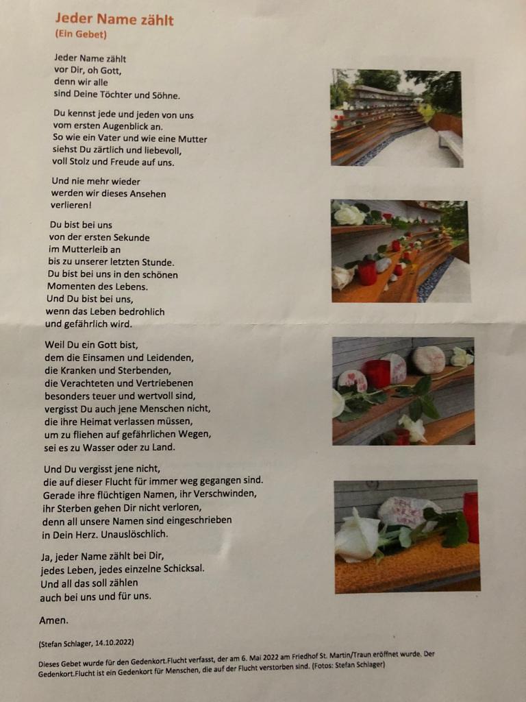 Musikalisch umrahmt wurde die Feier sehr stimmungsvoll von der Gruppe Acustica unter der Leitung von John Abraham aus Syrien. Zum Abschluss gingen alle hinaus zum Gedenkort.Flucht, entzündeten eine Kerze und sprachen gemeinsam das Gebet "Jeder Name zählt" von Stefan Schlager.