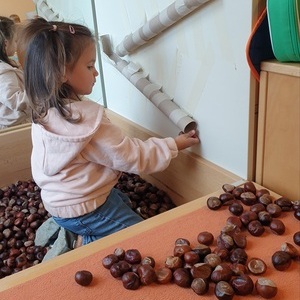 Wir haben die Wanne auch schon erweitert durch eine Kugelbahn aus Kartonrollen, denn es gibt nichts Spannenderes, als der Kastanie beim Kullern zuzusehen. Und auch hier singen wir wieder: „Schaut euch die Kastanie an, schaut mal wie sie kullern kann!“