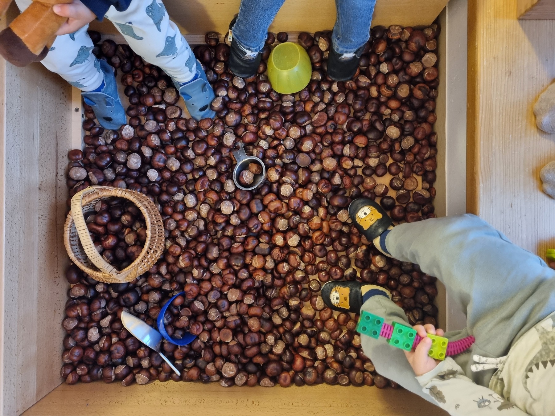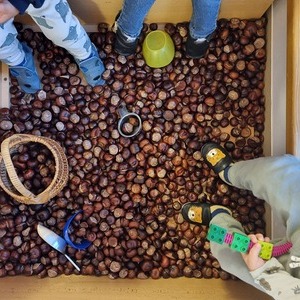 Kastanien sind sehr vielfältig und sprechen unsere Wahrnehmung auf ganz unterschiedliche Weise an. Eine besondere Erfahrung, die die Kinder in der Igelgruppe machen dürfen ist unser Kastanienbad. Mit vereinten Kräften haben die Kinder mit ihren Eltern, Geschwistern und Großeltern fleißig Kastanien gesammelt und voller Stolz in die Krabbelstube gebracht. Das Ergebnis kann sich sehen lassen: Eine ganze Wanne - gefüllt mit den Herbstschätzen. Nun erleben die Kinder mit all ihren Sinnen unseren neuen Spielbereich. Sie spüren die kühlen Kastanien auf ihrer warmen Haut und vergraben einzelne Körperteile unter den braunen Kugeln. Die Kinder hören ganz genau hin und erkennen: Kastanien können kullern oder auch plumpsen. Wenn die Kinder in die Wanne steigen und die Kastanien unter ihren Füßen wegrollen, entdecken sie ihren Gleichgewichtssinn. Durch Schütten, Rollen oder Tragen erfahren die Kinder ihren Körper in Bewegung und stärken ihre Motorik.