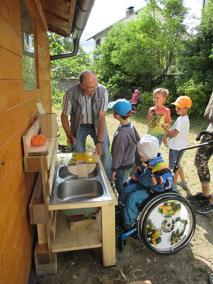 Herr Josef Angerer nahm sich wieder einmal Zeit für ein Anliegen des Kindergartens. Wir wollten für die Kinder in den letzten Wochen vor den Ferien eine „Sommerküche“ im Garten haben.